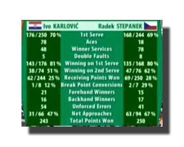 Above is a representation of how the pros tennis statistics are kept. This was a match between Karlovic and Stepanek where Karlovic had a record 78 aces and only 5 double faults. The pros utilize these tennis statistics but need sophisticated tennis software and expensive coaches and statisticians to help them. Each tennis statistic line is important. This watch will help you keep track of almost all the tennis statistics they show on TV when you watch majors.